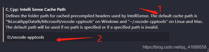 在VSCode找到设置→扩展→C/C++→Intelli Sense Cache Path,如上图。1处写明了vscode默认Intelli Sense缓存文件路径是在C盘的,2处可以更改为你要保存缓存文件的位置。据我所知,这些缓存文件删了也不影响的之前的文件的,所以可以随时删~只是每次编译又会重新产生,所以还是把缓存路径改为别的盘吧